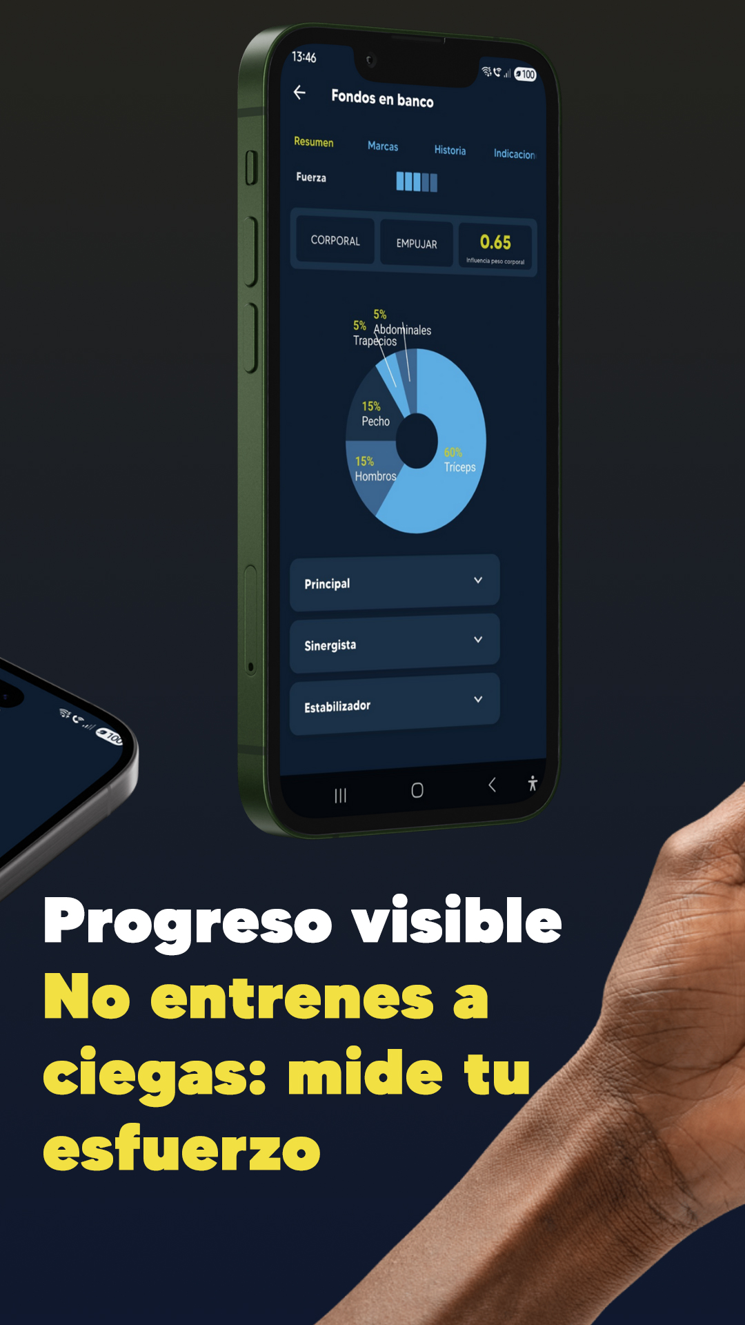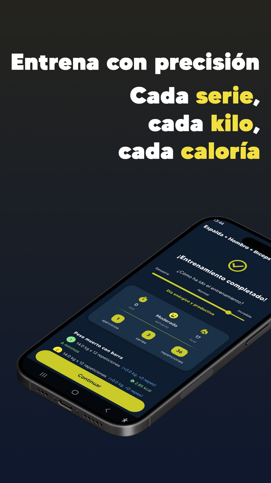 Registra cargas, repeticiones y sesiones. Visualiza tu evolución y rompe estancamientos.